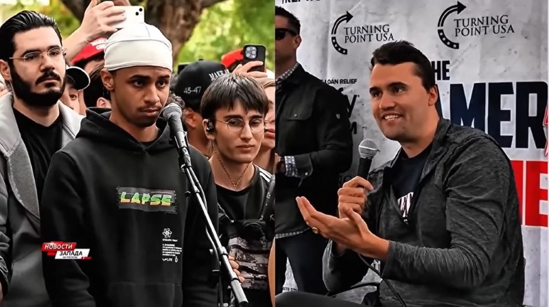 Участники дискуссии: Чарли Кирк (КРК) и палестинский араб (ПА)